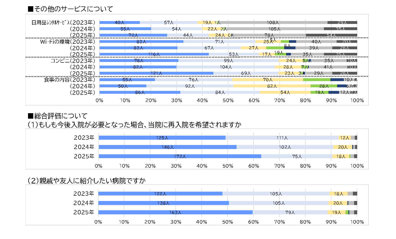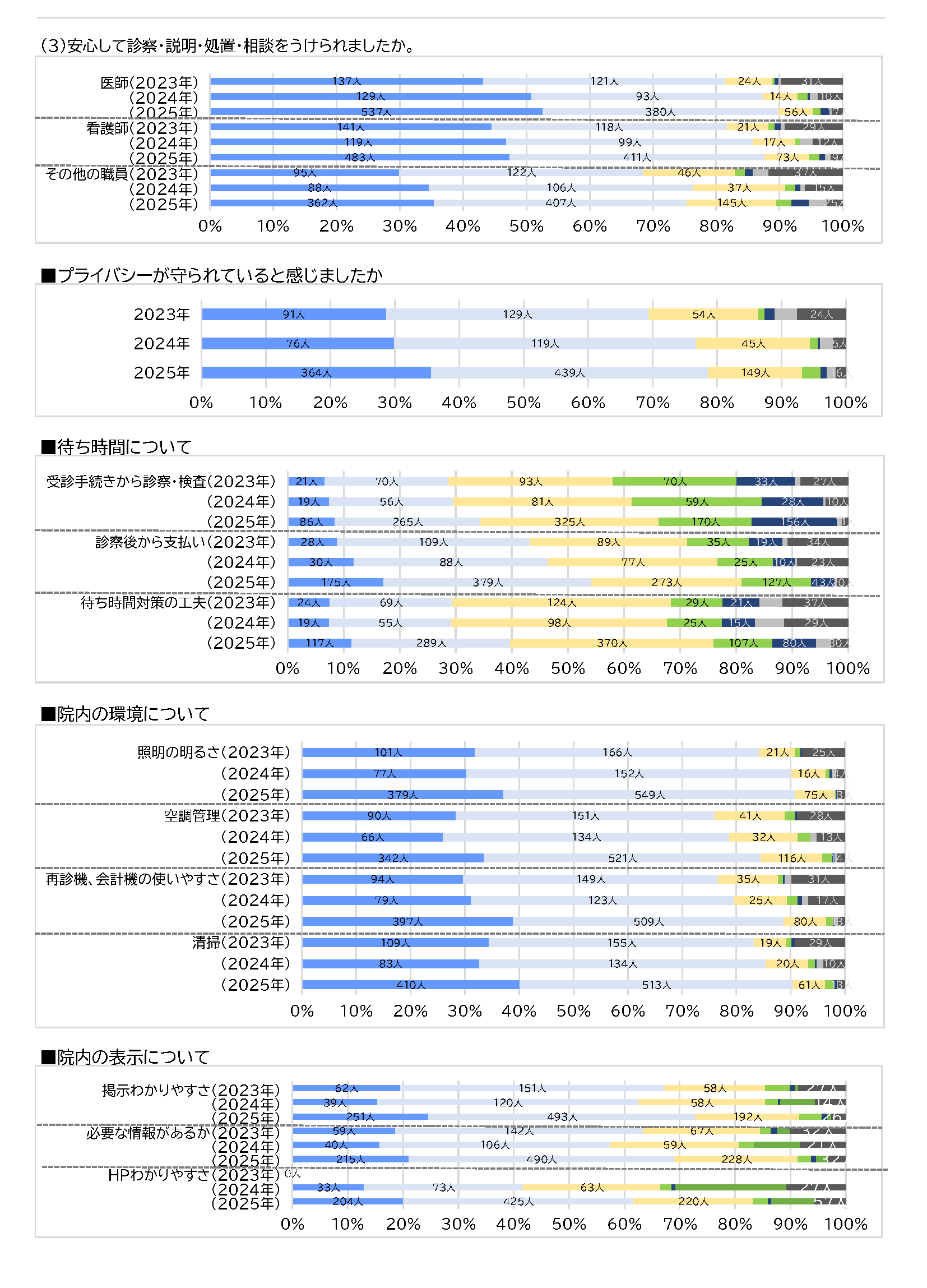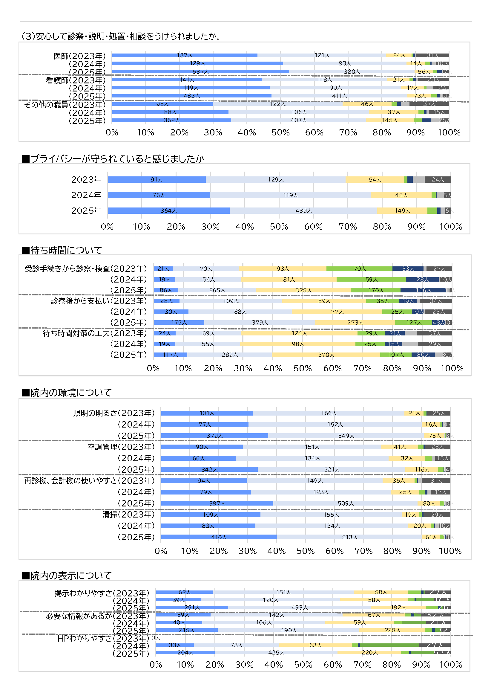Kitano Hospital is continually working to translate patient feedback into improvements. Every autumn, we conduct a questionnaire survey of outpatients and inpatients to identify areas for improvement and improve our patient services.