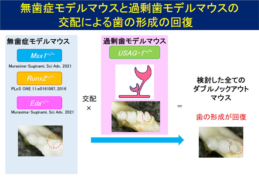 Congenital tooth loss is considered congenital edentulism, and the condition known as ectodermal dysplasia anhidrotic (EDA) is a rare disease with an incidence rate of 15.8 per 100,000 births. Because patients with congenital edentulism experience edentulism during childhood, when the jawbone is still developing, dentures and dental implants are difficult to use. This condition can lead to oral frailty (a decline in oral function for chewing, swallowing, and speaking) during growth, which can adversely affect nutritional intake and growth. Treatment is limited to replacement teeth using dentures or dental implants after adulthood, and there is a strong desire for the development of tooth regeneration therapy as a radical treatment.