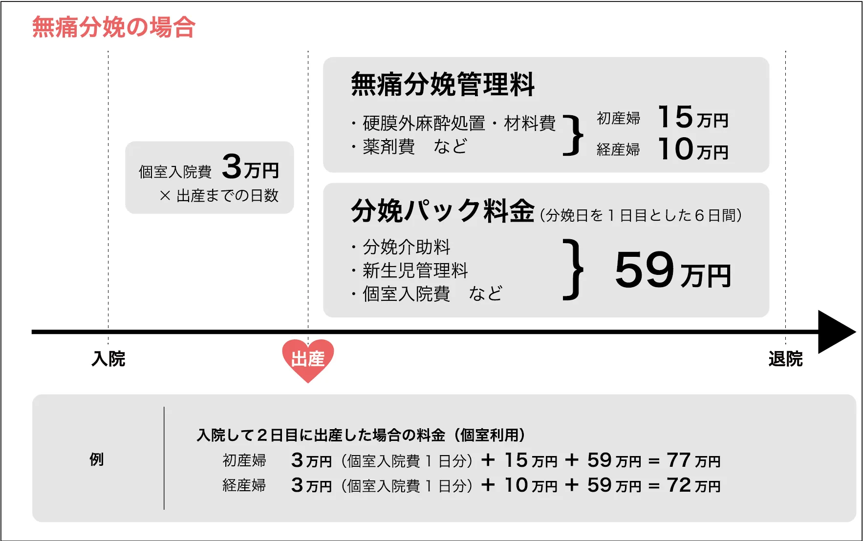 You will be admitted to the hospital before labor begins, and the next morning we will perform the following procedures: "procedure to dilate the cervix," "insertion of an epidural tube," and "administration of labor-inducing medication." Once labor begins, local anesthetics and painkillers will be injected into the epidural space through the tube. If labor does not begin by the evening, labor will be induced again the following day.