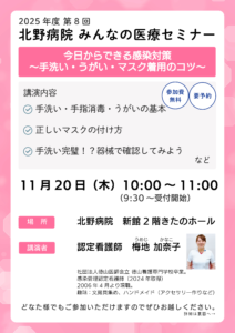今回は「感染対策」をテーマに、認定看護師が「手洗いの基本」「正しいマスクの付け方」などについて分かりやすく解説します。参加費は無料ですので、ぜひご参加ください。