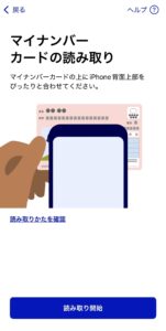 ⑥画面のとおりにマイナンバーカードとスマートフォンを配置し、「読み取り開始」を押してください。