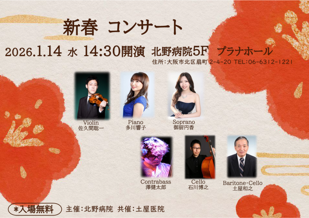 2026年1月14日(水)、土屋医院(大阪市東淀川区)様の協力のもと、本館5階プラナホールにて「新春コンサート」を開催します。予約不要・入場無料ですので、ぜひお越しください。