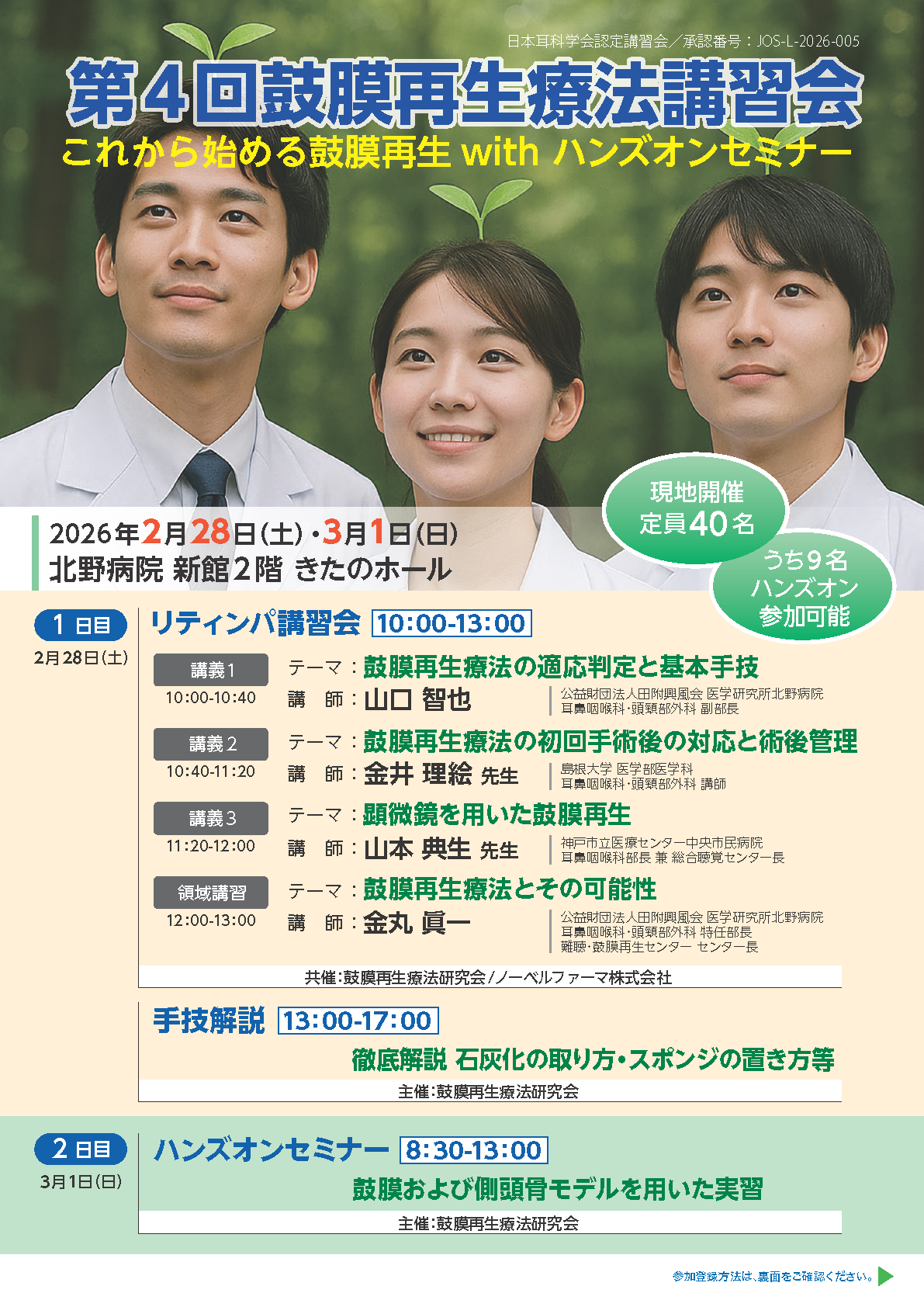 2026年2月28日(土)と3月1日(日)に鼓膜再生療法講習会を開催します。