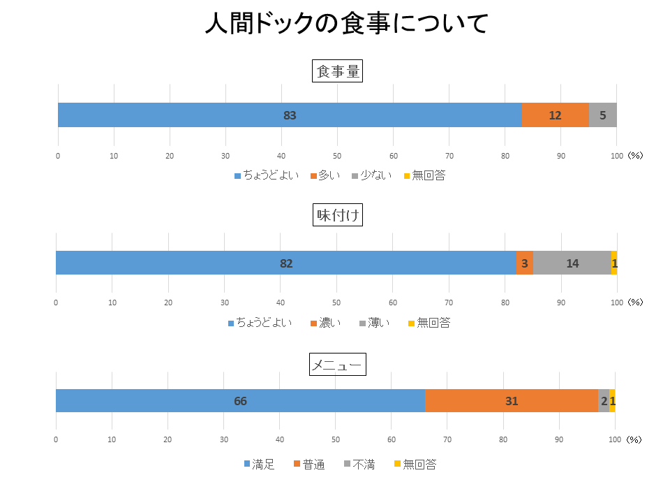 「バランスの良い食事でした」「色どり、盛り付けがきれい。目から入ってくるおいしさ、そして、食べておいしい、本当に素敵なお食事でした」「毎年ドック後のお弁当を楽しみに受診しています。今年もおいしかったです。特にゆばの小鉢と西京焼き」など様々なご意見をいただき、量や味付け、メニューについては概ね良好な結果でした。これからの献立にもご期待ください。
