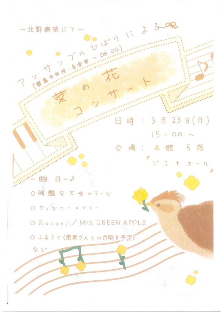 2026年3月23日(月)、大阪市立都島中学校 音楽部の皆さんによる「菜の花コンサート」を開催します。演奏を聴くだけでなく、患者さんの一緒に合唱できる楽曲もあります。予約不要・入場無料ですので、ぜひお越しください。