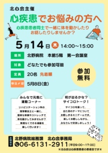 2026年5月14日、心疾患でお悩みの方の交流会を開催します。本交流会は北心会(※)の会員向けに企画したものですが、今回は会員以外の方でもご参加いただけますので、ぜひお気軽にお越し下さい。