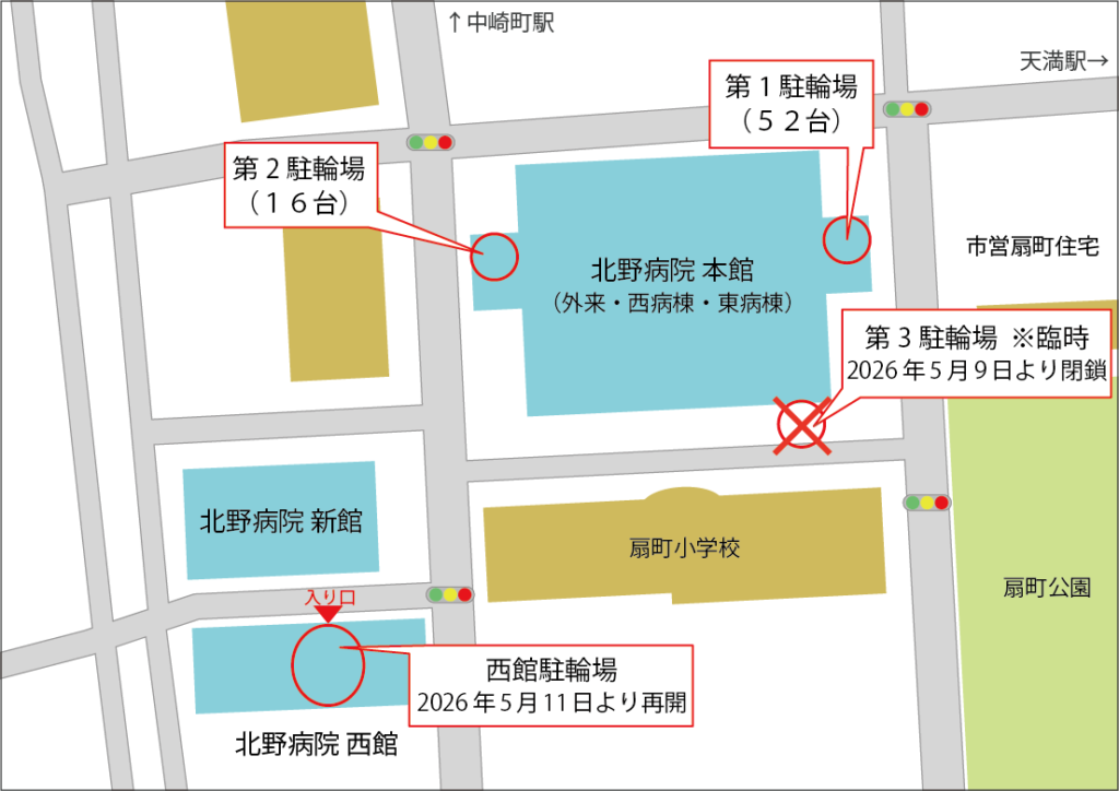 西館の建て替え中止に伴い、2026年5月11日(月)より「西館駐輪場」を再開します。