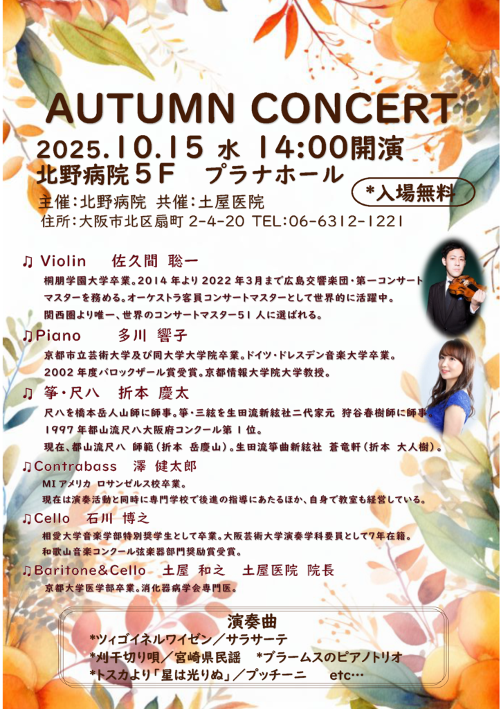 2025年10月15日(水)、土屋医院(大阪市東淀川区)様の協力のもと、本館5階プラナホールにて「オータムコンサート」を開催します。予約不要・入場無料ですので、ぜひお越しください。