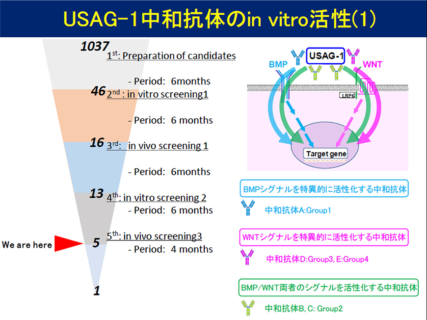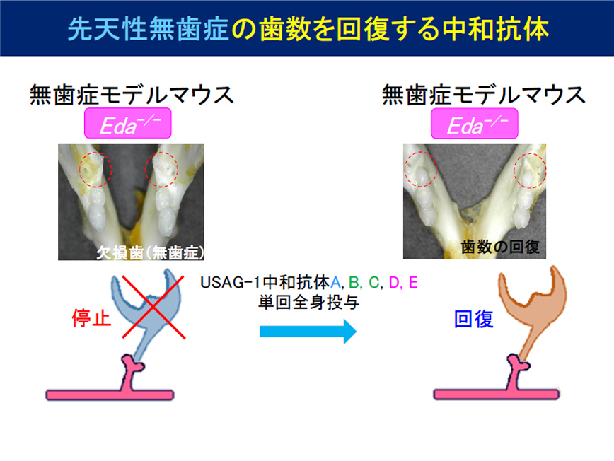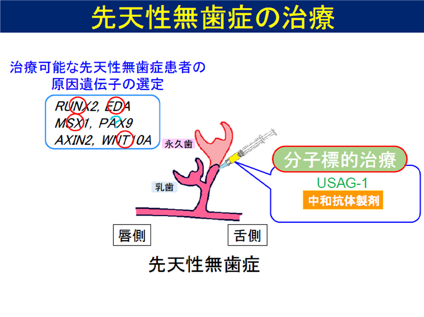USAG-1に対する分子標的薬であるヒト抗USAG-1抗体を投与し、歯を萌出させる治療法を目指す。